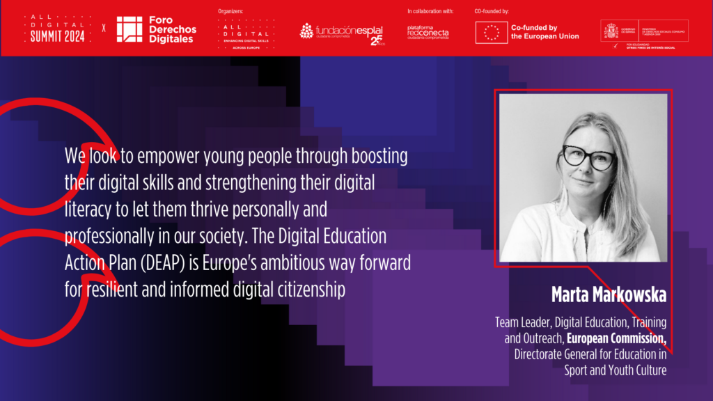 In today’s morning keynote speech, Marta Markowska, Team Leader for Digital Education, Training, and Outreach at the Directorate-General for Education, Youth, Sport and Culture, underscored the European Commission’s commitment: ‘’We look to empower young people by boosting their digital skills and strengthening their digital literacy to let them thrive personally and professionally in our society. The Digital Education Action Plan (DEAP) is Europe’s ambitious way forward for resilient and informed digital citizenship’’.