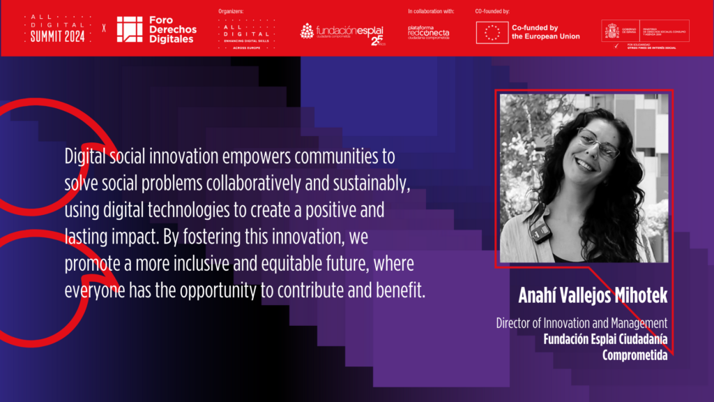 Civil society perspectives were represented in the keynote speech of Anahí Vallejos Mihotek, Director of Innovation and Management at Fundacion Esplai, who stressed: ‘’Digital social innovation empowers communities to solve social problems collaboratively and sustainably, using digital technologies to create a positive and lasting impact. By fostering this innovation, we promote a more inclusive and equitable future, where everyone can contribute and benefit’’.